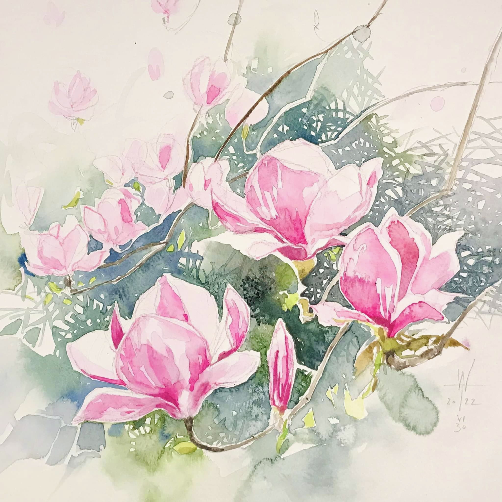 RÓŻOWE MAGNOLIE - 2 lekcje akwareli